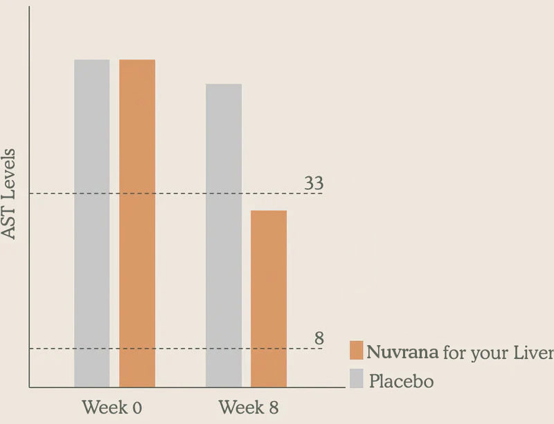 In a double-blind, placebo-controlled human clinical study, Nuvrana for your Liver decreased ALT and AST levels when taken twice daily*